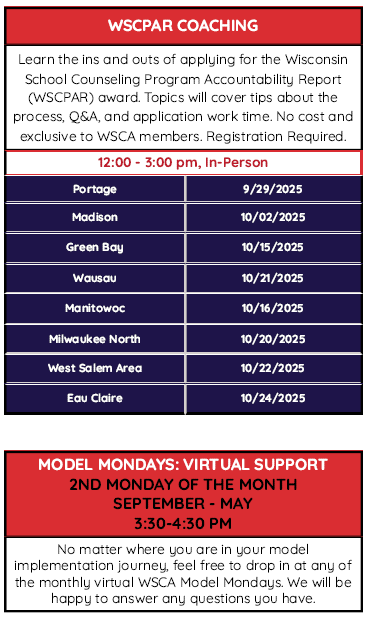 Model Mondays: Join WSCA leaders to talk about any and all things related to ASCA model implementation! If you are just beginning a model program or at the point of applying for RAMP, all levels are welcome, this is your space to talk and collaborate. This drop in virtual monthly support is the second Monday of the month from 3:30-4:30. This is a member benefit and complimentary with an active membership, however, registration is required.